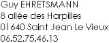 Guy EHRETSMANN ne saurait garantir l'exactitude et l'exhaustivité des informations diffusées sur le site. Il ne saurait ainsi être tenu pour responsable des erreurs ou omissions, ainsi que des indisponibilités d'informations. Les informations consultables sur le site le sont à titre informatif et constituent une offre de services.